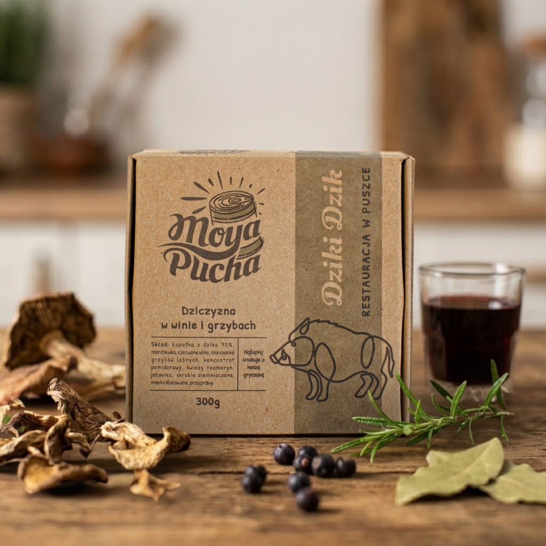 Dziczyzna uznawana jest za mięso szlachetne i naturalne w smaku, dlatego nie mogło jej zabraknąć w naszej puszkowej ofercie. Dzik duszony w czerwonym winie z leśnymi grzybami i marchewką baby to obiad z charakterem - aromatyczny, treściwy i naprawdę „dziki”.