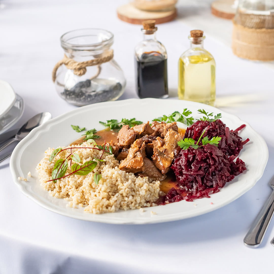 Udo z kaczki 70%, żurawina, sok z cytryny, tymianek, mąka