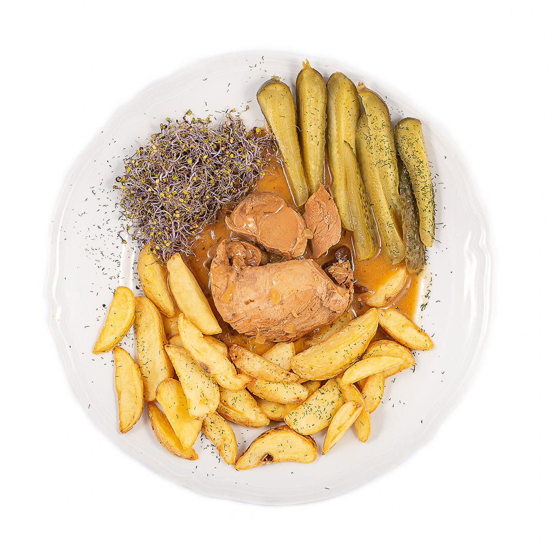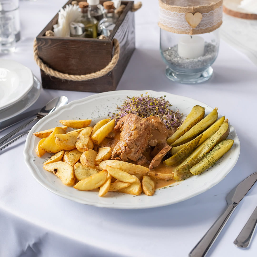 Leśny Wieprzek najlepiej smakuje z pieczonymi ziemniakami i kiszonym ogórkiem.