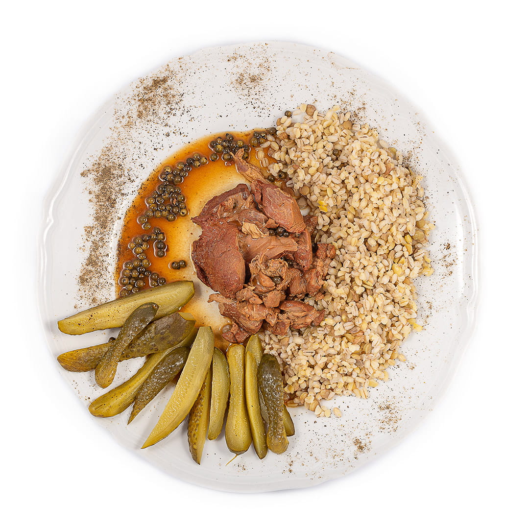Popieprzone Ciele najlepiej smakuje z kaszą pęczakiem i ogórkiem konserwowym.